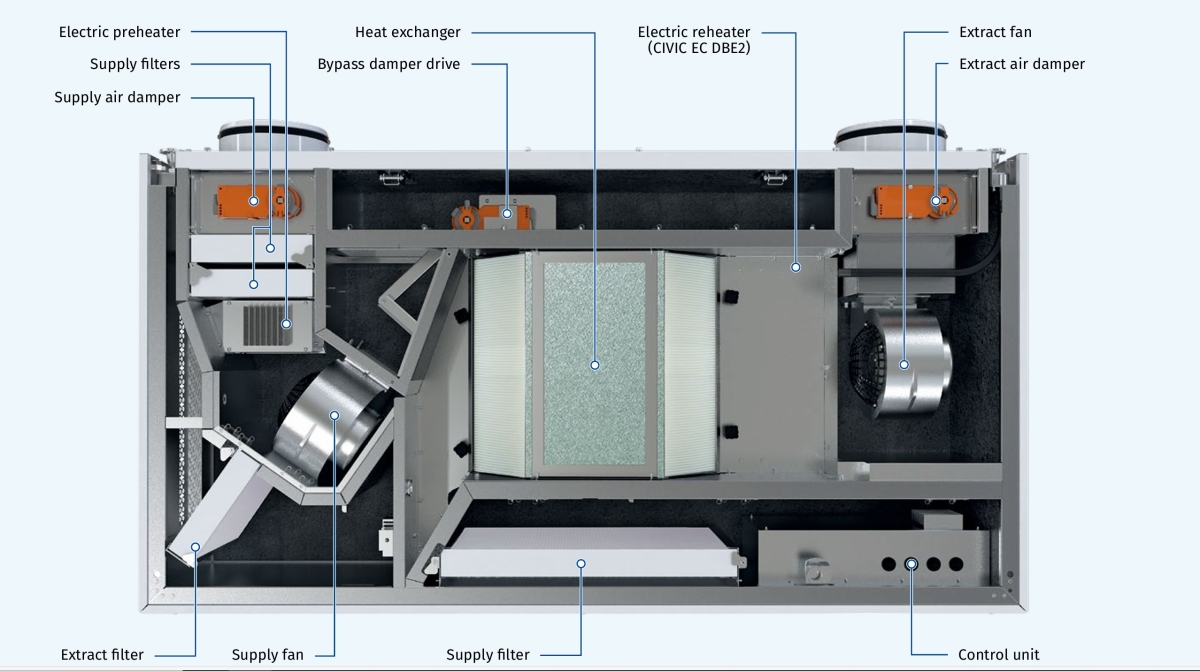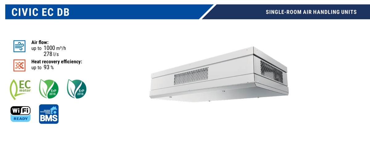 Sistem complet de ventilație cu dublu flux și recuperare de căldură, special proiectat pentru spații publice: școli, grădinițe, birouri și alte instituții.