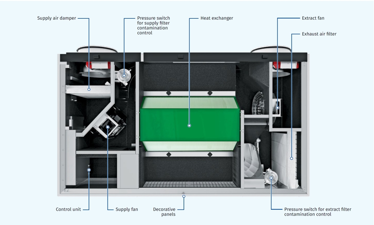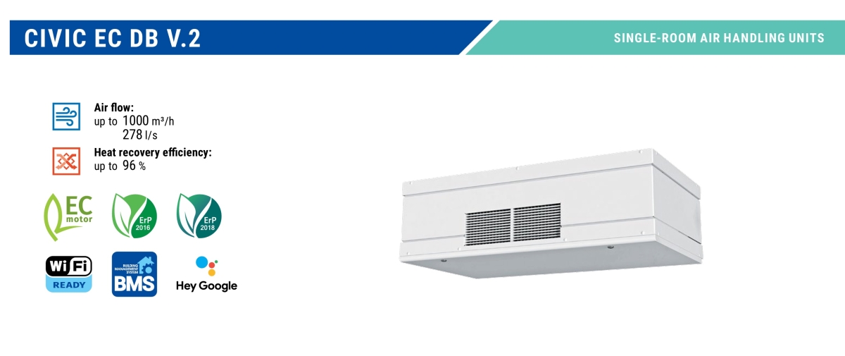 Sistem complet de ventilație cu dublu flux și recuperare de căldură, special proiectat pentru spații publice: școli, grădinițe, birouri și alte instituții.